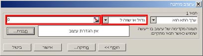 את התפריט הנגלל מימין נשאיר כמו שהוא ("ערך התא הוא"). בתפריט הנגלל שלשמאלו נבחר "גדול או שווה ל", ובחלונית שמשמאל נזין את הערך 0.