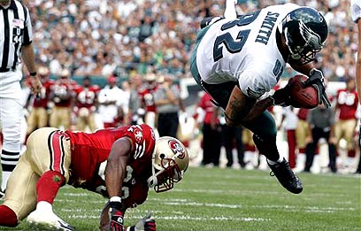 אל.ג'יי. סמית' בדרך לטאצ'דאון של האיגלס על חשבון טוני פאריש (איי.פי)