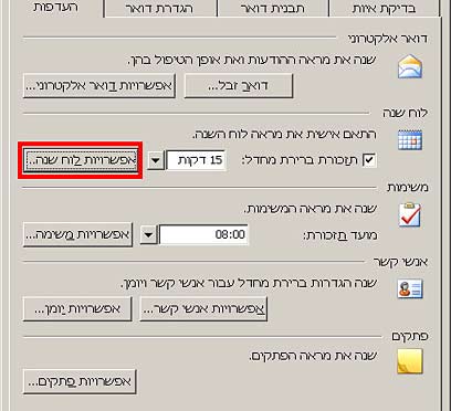 בשלב ראשון נכנסים לחלון כלים / אפשרויות, חוצץ העדפות, ומקליקים על הכפתור אפשרויות לוח שנה.