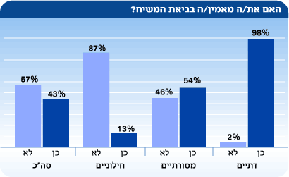 הממצאים עולים ממחקר רחב-היקף של מכון סמית ו-ynet, שהתבצע בשבוע האחרון. המחקר בחן את עמדות הציבור בנושא אמונה ויהדות. הנתונים נאספו בשתי שיטות: סקר טלפוני בקרב מדגם מייצג של האוכלוסיה הבוגרת (500 איש, טעות מדגם 4.5%); ובמקביל - משאל אינטרנטי שהצגנו ב-ynet, עליו השיבו יותר מ-40 אלף גולשים במהלך הימים האחרונים.