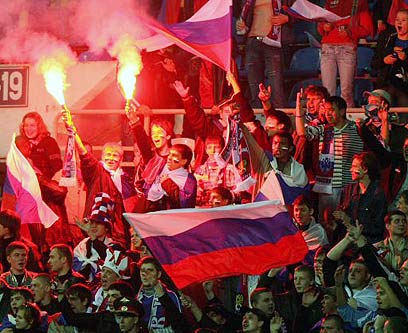 אוהדי נבחרת רוסיה חוגגים את שער היתרון (צילום: רויטרס)