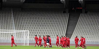 הפועל מתאמנת על רקע היציעים הריקים, אמש (צילום: ספורט טיימס)
