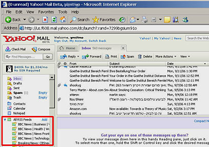 גישה לערוצי RSS משולבת בעץ התיקיות הרגיל, בחלונית השמאלית