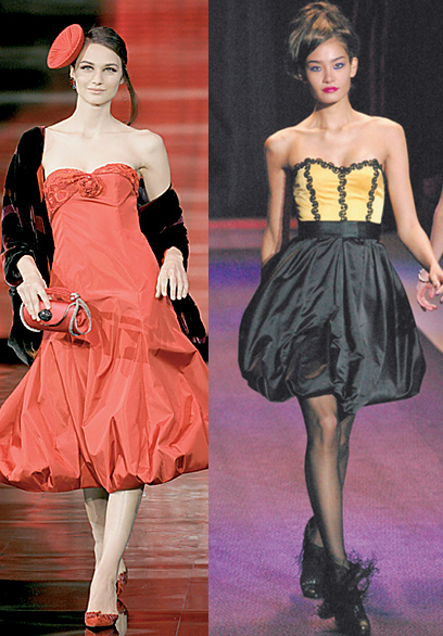 מימין: חצאית בלון בסגנון רוקיסטי, מתוך תצוגה של בטסי ג'ונסון; משמאל: מתוך תצוגה של "ארמאני"