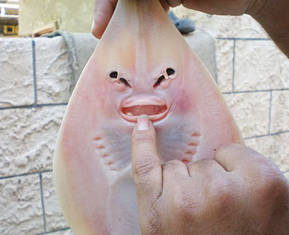 ומה לגבי הדימיון לפנים של אדם? "הפה של הדג, הוא נטול שיניים כמובן, והחתיכה הלבנה בפיו הדומה לשן, זה כנראה שריד לדבר שנשאר בפה. הפה של הדג הוא למעשה משטח פסיפס ועל ידי גירוד השפה התחתונה והעליונה, הוא מפצח שבלולים וקונכיות. החורים הגדולים הם הנחיריים והעיניים של הדג נמצאות בחלקו העליון", מציין ד"ר גולני. "הגיטרן ניצוד גם למטרות מזון, אך אינו נחשב דג מאכל משובח במיוחד, כמו כל דגי הסחוס הוא אינו כשר, אך ברצועת עזה הוא נחשב מעדן פופולארי".