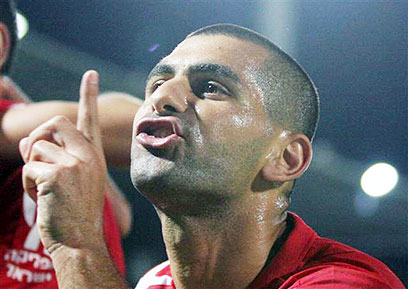 טועמה מסמן לקהל של מכבי לשתוק, אחרי השער (צילום: אלי אלגרט)