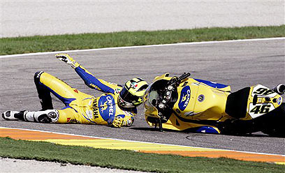בוולנסיה, הרקע לסיום העונה הדרמטי, נראה כי הכול תלוי בידיו של רוסי, ששייט בקלילות למקום ראשון במקצי הדירוג. אבל דווקא ברגע הגדול ביותר, לפני כתיבת הפרק האחרון בסיפור האגדות שלו, משהו בוולנטינו כבה. לאחר זינוק גרוע הוא כבר ראה את גבם של יריביו והתקשה לעקוף אותם. בהקפה החמישית הגיע רגע לא אופייני - 'הדוקטור' טעה, "איבד" את הגלגל הקדמי, החליק לחצץ ואיבד למעלה מ-20 שניות. כאשר חזר למסלול היו זמני ההקפה שלו ממוצעים בלבד, והוא לא הצליח לסגור את הפער למקום שהיה מאפשר לו לשמור על האליפות. התואר הלך להונדה של היידן.