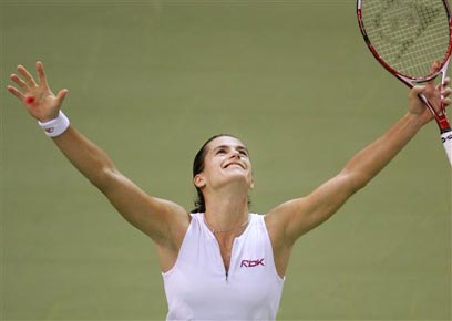 ז'וסטין הנין חוגגת ניצחון ומקום ראשון, בחצי הגמר (צילום: איי פי)