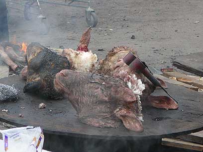ומי שרוצה יכול גם לטעום ראשי כבשים המתבשלים במים רותחים בתוך חביות, כאלה שאצלנו מחממים בהן זפת, על עצי מדורה. ראשי כבשים נחשבים לחלק הכי זול במדינה עתירת בשר זו, ומי שידו משגת קונה ראש כזה שאמור להספיק למשפחה של שש נפשות. טעמנו. לא משהו.