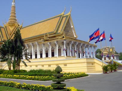 נהג הסירה הבטיח שנגיע תוך שלוש שעות לפנום פן אבל הן מתארכות לכמעט חמש. מספיק זמן כדי לראות שהאלמנט הבולט ביותר על הגדות - מקדשים. מקדשים בודהיסטים גדולים וחדשים שנראים למרחוק בזכות גגותיהם הזוהרים מצבע הזהב וקירותיהם הלבנים הבוהקים. המראה צורם אל מול גגות הפח החלודים של בקתות האיכרים. זה צורם עוד יותר כשאני הולך למקדש אודאנלום, בפנום פן.