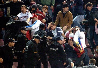 אלימות ביציעים, במשחק במקדוניה (צילום: איי פי)