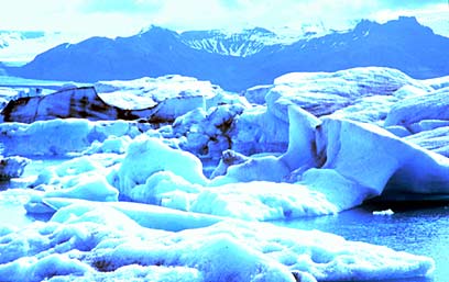 מהקרחון יורדות אל האגם שתי שלוחות: הקרובה - כלשון גדולה הבנויה גלים, והרחוקה - עמודים זקופים, תלולים, מחודדים ומשוננים. ניתן בנקל להבחין בקרחון בסדק גדול ובו נטיפים תכולים של קרח. במקום אחר שקע זוהר בצבעי טורקיז. לאחר חיפוש מצאנו מערה טבעית של קרח, שהאור החודר אליה בעוצמות שונות, מאיר אותה בגוונים שונים של כחול. זחלנו תחת הקרח ונכנסו לאולם גדול, עגול, זוהר וכחול. תחושה של בית זכוכית יפהפה המקרין קור והדר.
