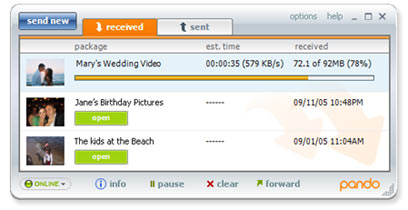 לחיצה על הקובץ הקטן (על הנמען להשתמש ב-Pando) תפתח את תוכנת Pando ותתחיל להוריד את הקובץ השלם מהשרת. עם ההורדה כל הקבצים מתווספים לתיקיה מיוחדת בשם My Pando Packages בתוך My Documents.