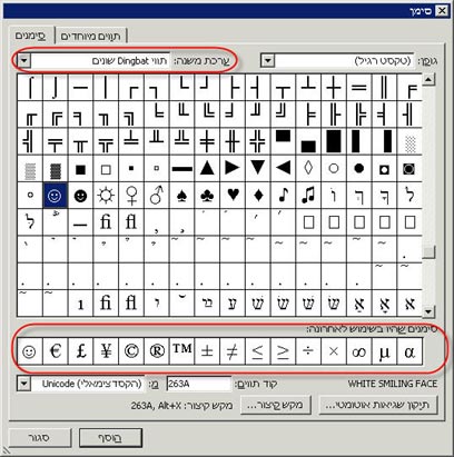 מתוך מעבד התמלילים Word תוכלו לבחור הוספה (Insert), סימן (Symbol) ואז תיפתח בפניכם רשימה של סימנים אשר ניתן להוסיף לטקסט. כל שעליכם לעשות בשלב הזה הוא לבחור סימן ואז ללחוץ על כפתור הכנס (Insert).