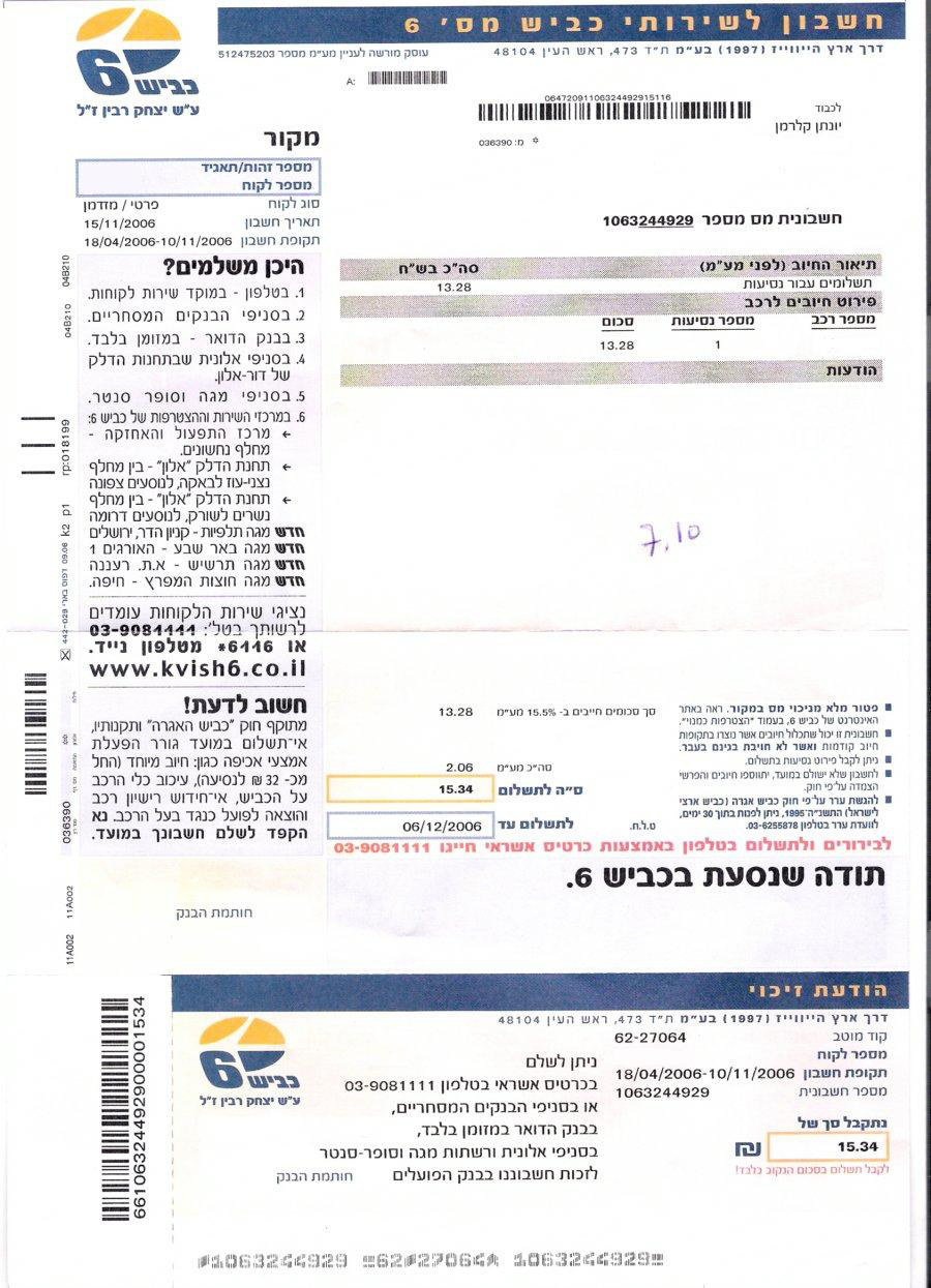 לידיעתכם, דרך ארץ הייווייז (תגידו, כולם עברו לאנגלית?) היא החברה ששולחת חשבון לשירותי כביש 6, חוצה ישראל. ומה כתוב בחשבון? "תשלומים עבור נסיעות". נפלא. איזה נסיעות, מתי, מהיכן להיכן? את זה תוכלו לדעת תמורת תשלום נוסף. פשוט כך. תגידו שבן אדם מסודר אמור לדעת מתי השתמש בשירותים כלשהם ומתי לא, ולגלות כך להיכן ומהיכן נסע? אתם צודקים, אלא שאפילו תקופת התשלום לא עוזרת: בחשבונית שלי כתוב: "תקופת חשבון 18/04/2006-10/11/2006". זהו.
