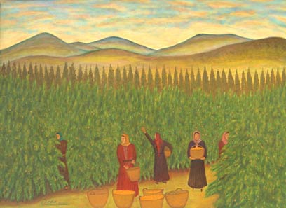 "נשים קוטפות תפוזים", סלאח חיג'אזי, שמן על בד, 2002