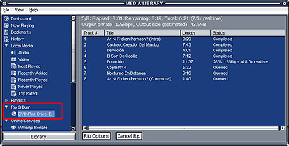 - כדי להעתיק את כל המוזיקה שבתקליטור לדיסק הקשיח, מקליקים על הכפתור Rip בתחתית החלון ובוחרים ב-Rip all tracks. כדי להעתיק רק חלק מהתקליטור, מסמנים את השירים הרצויים (מחזיקים את מקש Ctrl לחוץ ומקליקים על השירים שרוצים להעתיק) ובוחרים Rip selected tracks.