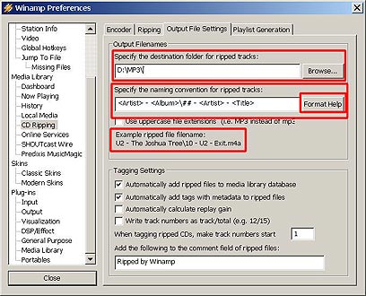את רוב המאפיינים לא ניתן לשנות בגירסה החופשית של WinAmp. המאפיינים העיקריים שכדאי לשנות בכל זאת נמצאים בחוצץ Output File Settings והם תיקיית היעד לקבצים המועתקים (destination folder) ומבנה שמות הקבצים (naming convension).