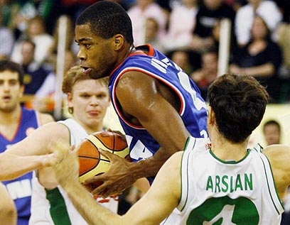 כריס וורן מציבונה מוקף בשחקני לובליאנה (צילום: רויטרס)
