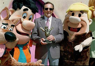 ברברה לצד כמה מהדמויות המפורסמות של האנה-ברברה. משמאל: סקובי דו, פרד פלינסטון וברני אבן (Barney Rubble), לאחר שקיבל פרס מפעל חיים מהאקדמיה לטלוויזיה ב-1996. (צילום: אי.פי)