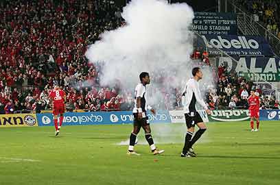 שחקני בית"ר על רקע רימון ההלם שעורר את כל המהומה (ראובן שוורץ)