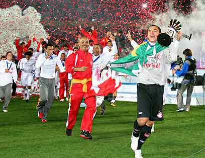 רוצים עוד תואר. שחקני אינטר עם הגביע הביניבשתי (צילום: איי פי)