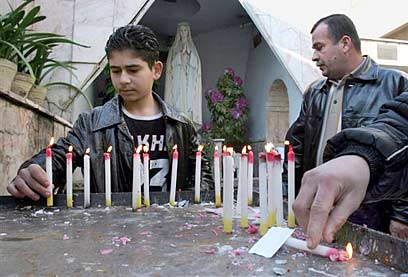 עיראקים נוצרים מדליקים נרות לאחר המיסה של יום ראשון בכנסייה הקתולית בבגדד. רוב העיראקים יחגגו את חג המולד בבתיהם עקב המצב הבטחוני המתדרדר ברחובות (צילום: איי פי)