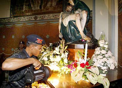 שוטר אינדונזי מיחידת החבלנים מבצע חיפוש בקתדרלה המרכזית של גָ'קַרְטָה. במהלך החג נפרשו בעיר כ-18 אלף שוטרים וכ-2,000 חיילים (צילום: רויטרס)