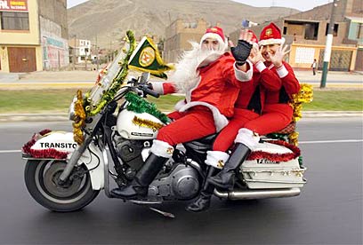 שוטרי תנועה בפרו, הלבושים בבגדי סנטה והעוזרים שלו, בדרכם למופע חג המולד בלימה. קבוצה גדולה של שוטרים המחופשים לסנטה כבשה את רחובות פרו והעניקה מתנות לילדים עניים (איי פי)