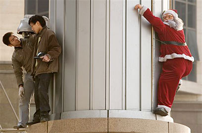זוג סינים בודקים את מצלמת האבטחה המוצמדת לעמוד עליו תלויה בובה של סנטה, מעל למרכז קניות חדש בבייג'ינג. חג המולד הפך פופולרי בשנים האחרונות בסין משיקולים כלכליים - הסוחרים מעודדים את הציבור לקנות מתנות לחג לא להם (צילום: איי פי)