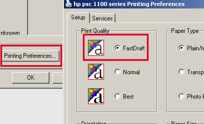 - השלב הבא תלויים בסוג המדפסת, אולם בדרך כלל יש להקליק על Printing Preferences. התיבה המוכרת, בה בוחרים תמיד באפשרות הטיוטה (Draft) בהדפסה תופיע גם כאן. בחר באפשרות זו והקלק על OK ושוב על OK. כעת ברירת המחדל היא איכות טיוטה