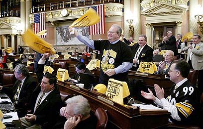 חברי בית הנבחרים בפיסטסבורג חוגגים את זכייתה של קבוצת הפוטבול של עירם, פיטסבורג סטילרס, בסופרבול ה-40. הסטילרס ניצחו את סיאטל סי-הוקס 10:21 והם הקבוצה החמישית בתולדות ה-NFL שזכתה חמש פעמים בתואר, לצד דאלאס קאובויס וסן פרנסיסקו 49' (צילום: איי פי)