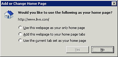 שתי האפשרויות הראשונות הן זהות בשני המקרים; אם תבחרו בראשונה (Use this webpage as your only home page) תגדיר לדפדפן שלכם להשתמש בדף הנוכחי כדף הבית היחידי, ותמחק את האחרים, האפשרות השניה (Add this webpage to your home page tabs) תוסיף את העמוד הנוכחי כדף הבית.