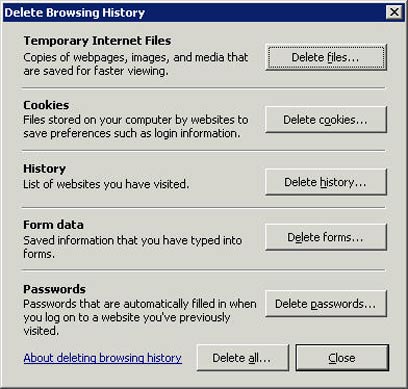החלון שנפתח (ראו תמונה בהמשך) מאפשר לכם לבחור מה תרצו למחוק. בכל המקרים צריך פשוט ללחוץ על הכפתור המתאים, ואז לאשר את פעולת המחיקה. האפשרות הראשונה – Temporary Internet Files תמחק את הקבצים שנשמרו על המחשב שלכם. מדובר לרוב בהעתקים של דפים, תמונות, סרטונים ועוד, אשר נשמרים על המחשב שלכם, כדי לאפשר לכם גלישה מהירה יותר.