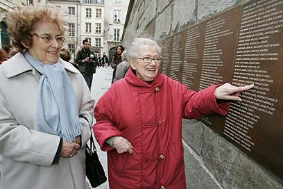 אודט ליניו (מימין) שהצילה את פלור קמינסקי (משמאל), מצביעה על שמה בלוח (צילום: סי"צ)
