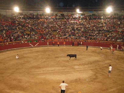 עם הזרם הגענו לקולוסיאום "Encierro de reses bravas". הראשונים להיכנס היו הצעירים שבאו בקבוצות, הם נבדלו בצבע חולצתם וצבעו את היציעים - בירוק, לבן, אדום, כחול וורוד - בצבעי המשתתפות.