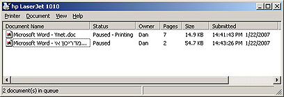 לחיצה כפולה על אותו אייקון יפתח עבורכם חלון אשר נקרא Print Queue - "תור הדפסה". בחלון תופיע ההדפסה ששלחתם. בחלון זה תוכלו לראות גם פרטים נוספים על ההדפסה, כגון - שם המסמך, מצב ההדפסה (מדפיס, בהמתנה וכו'), מי שלח להדפסה, מספר עמודים, גודל הקובץ ומתי הוא נשלח להדפסה. אם שלחתם יותר מהדפסה אחת – כולן יופיעו ברשימת המתנה להדפסה (בגלל זה קוראים לזה תור הדפסה). בתמונה הבאה תוכלו לראות שני מסמכים שמחכים להדפסה: