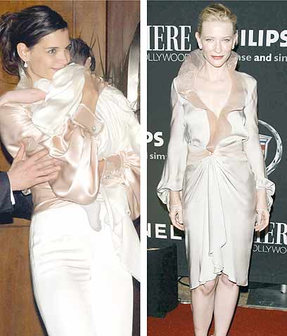 קייטי הולמס, שעוברת חינוך מחדש בסטיילינג, הגיעה לארוחת הערב החגיגית שלפני חתונתה בחולצה של "ג'ורג'יו ארמני". קייט בלנשט האצילית בחרה גם היא באותה חולצה והתאימה לה חצאית אלגנטית