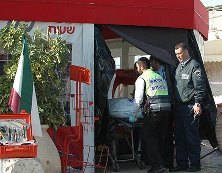 מפנים את אחת הגופות מזירת הרצח (צילום: ישראל יוסף)