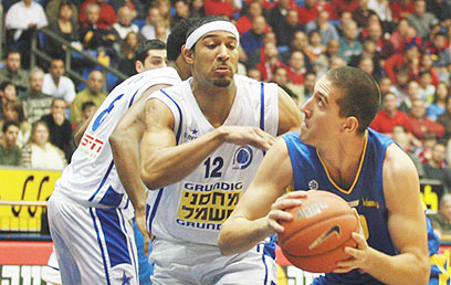 קוקי בלצ'ר לא מאפשר לבורשטיין לראות את הסל (צילום: אלי אלגרט)