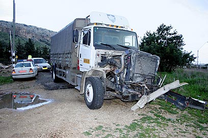 המשאית שנפגעה בתאונה (צילום: עידו ארז)