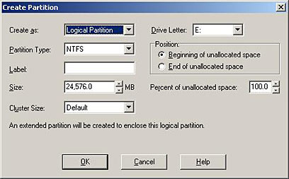 לחיצה ימנית על המקום הריק שנוצר בכונן תאפשר לכם לבחור באפשרות Create. אז תוכלו לבחור את הגודל הרצוי, את אות הכונן, את סוג הקבצים ועוד. אם בכוונתכם להתקין על מחיצה זו מערכת הפעלה - חשוב שהיא תהיה מסוג Primary.