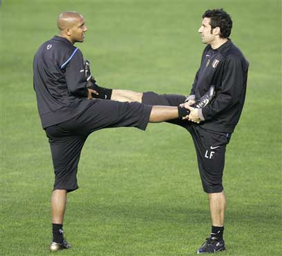 רגל פה, רגל שם. פיגו ואוליבייה דאקור באימון המסכם (צילום: איי פי)