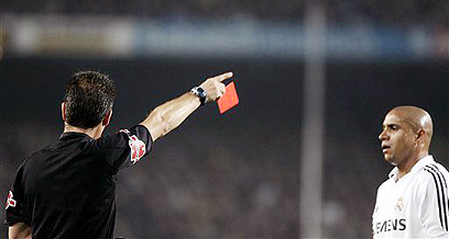 שופטים של ברצלונה? רוברטו קרלוס רואה כרטיס (צילום: רויטרס)