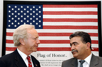 פרץ והסנאטור ג'וזף ליברמן (צילום: אריק חרמוני, משרד הביטחון)