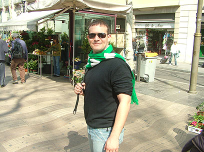 אוהד חיפה בתמונה למזכרת מרחובות ברצלונה (צילום: עדי סרדס)
