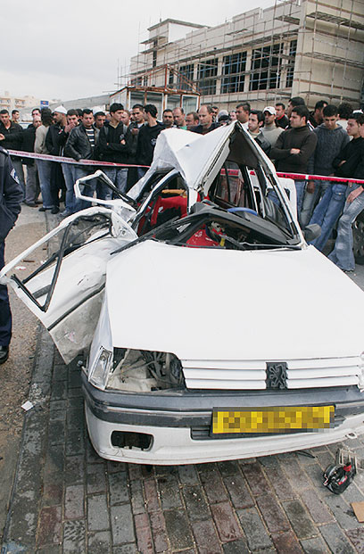 סקרנים מקיפים את הרכב שבו נהרגו הצעירים בירכא (צילום: ודים דניאל)