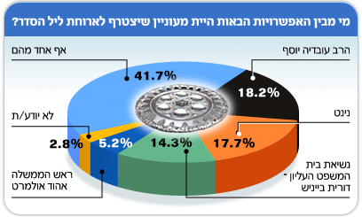 ועם מי נרצה לעשות את הסדר? מנהיגה הרוחני של ש"ס, הרב עובדיה יוסף, הוא המבוקש ביותר (18%), וגם הוא לא האמין שיוביל אי פעם רשימה כלשהי יחד עם נינט טייב, סולנית ראויה בהחלט ל"מה נשתנה" וצמודה לרב עובדיה בסקר. הכוכבת שנולדה רק לפני 4 שנים זוכה לתמיכה מפתיעה גם אצל החרדים (14%) והדתיים (6%).