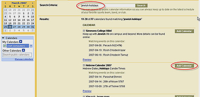 אם נעבור לתצוגת חודש (Month בתפריט Calendar) נוכל לראות שהתווספו החגים היהודיים. החסרון הוא - היומן של Yahoo לא כולל חגים ישראליים. חבל, אבל אולי בשנה הבאה.