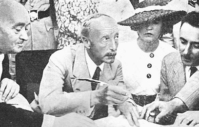 20 ביוני 1935. הנחת אבן הפינה לבניין הבימה. משה שרת, השחקנית חנה רובינא והנציב העליון גרנפל ווקופ